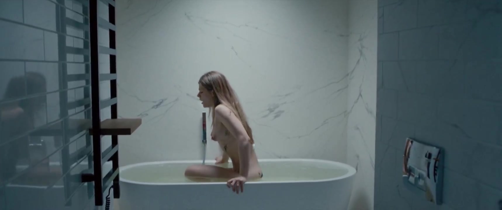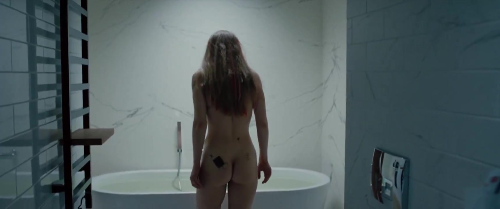 Another scene where she climbs into a bathtub, revealing her breasts, bush, and butt.