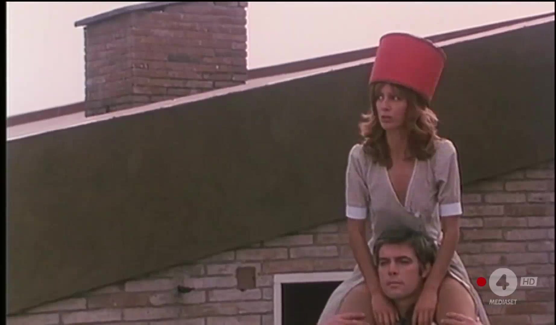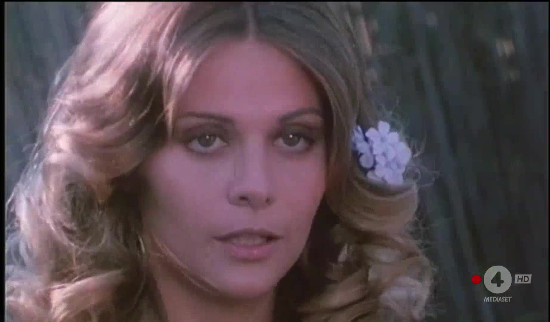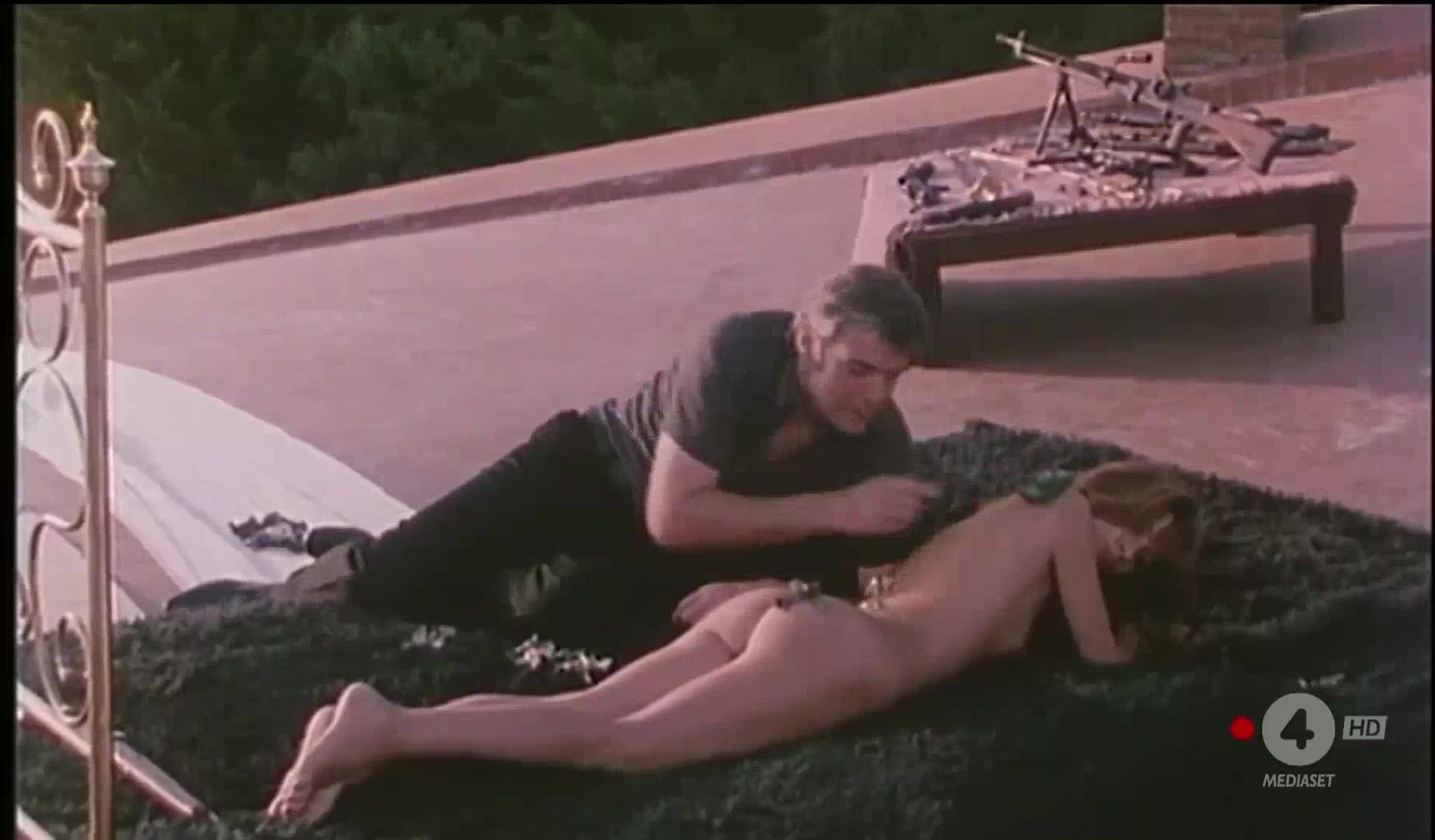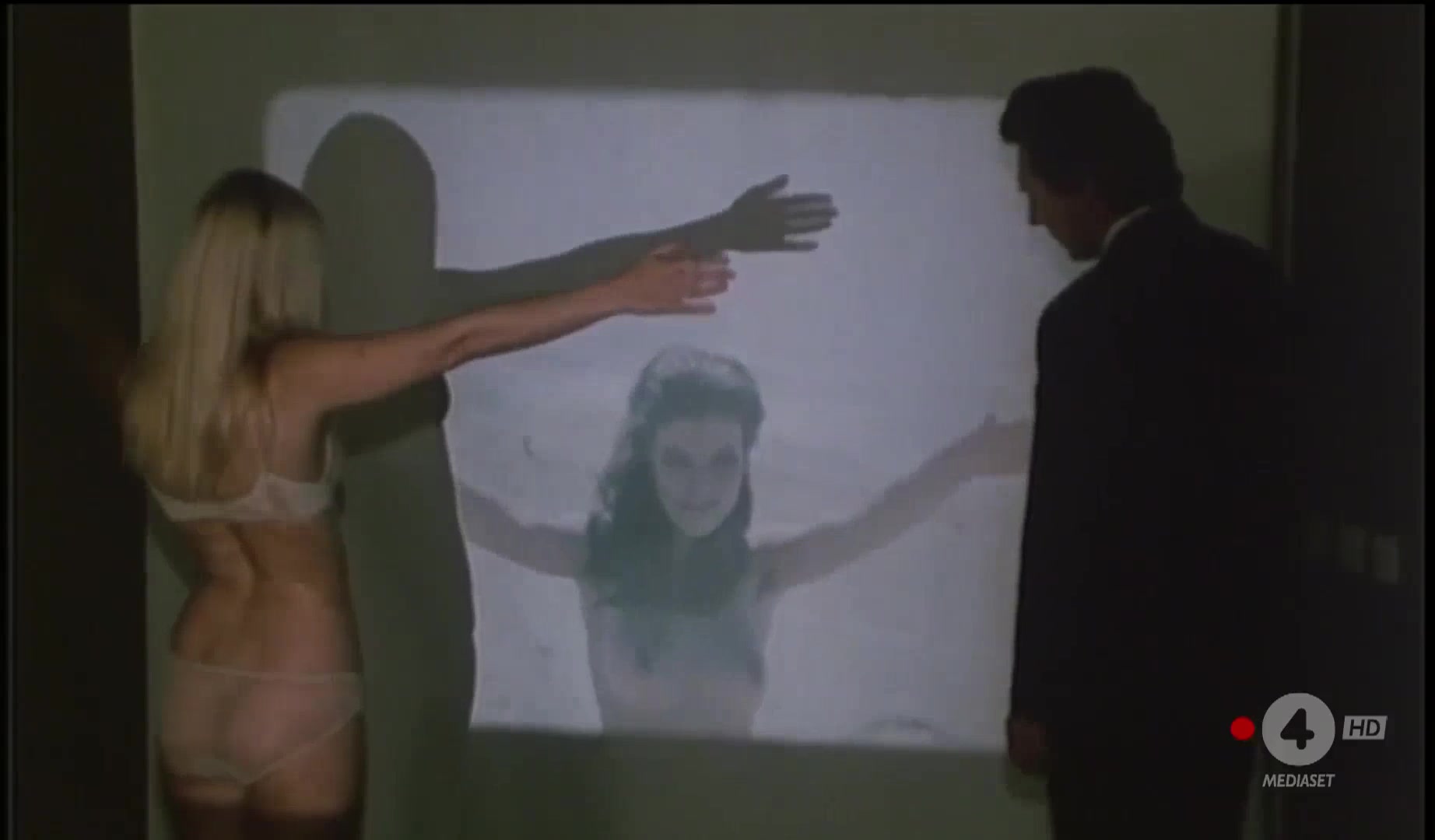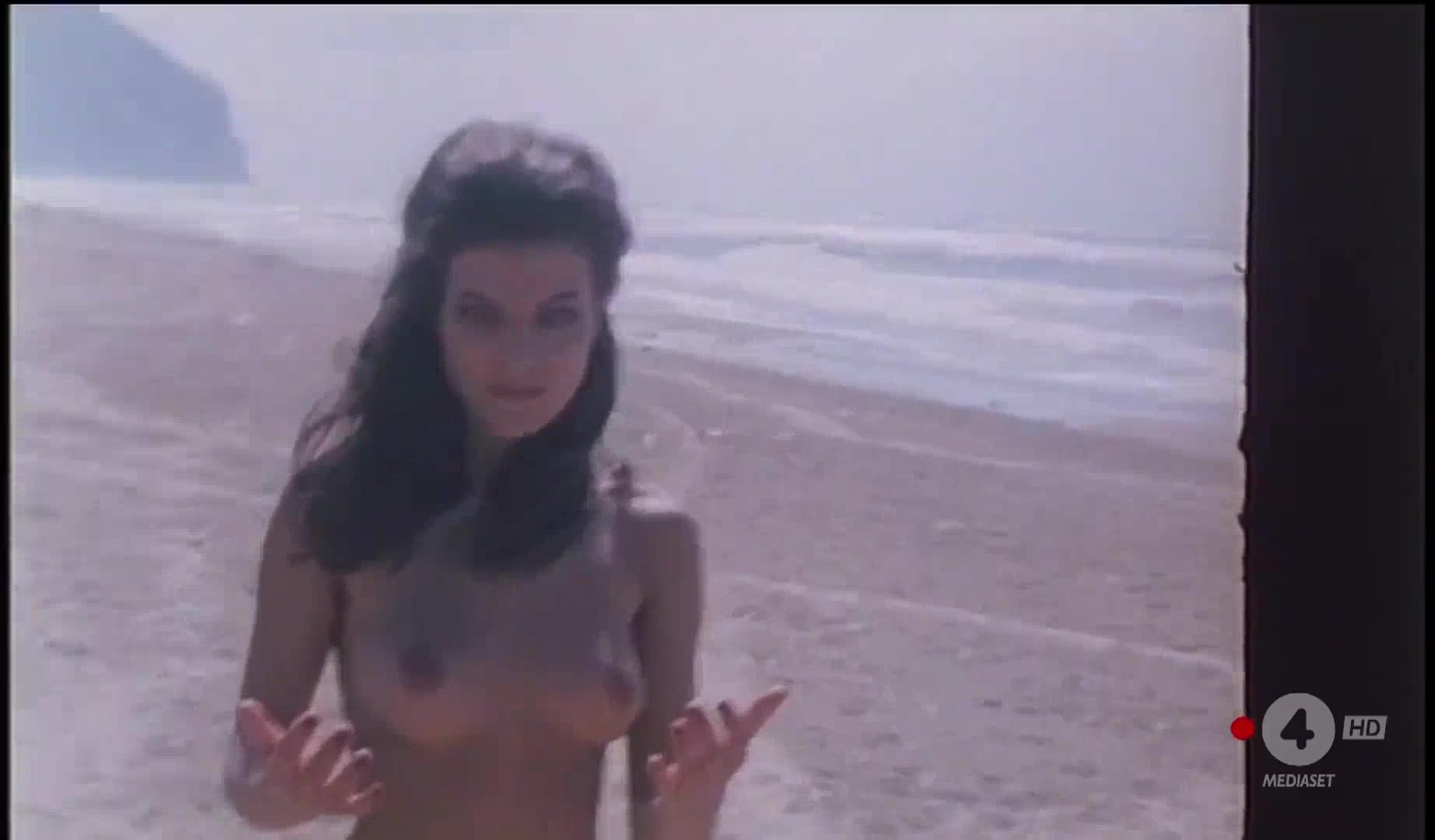 Silvia Dionisio is featured in a scene dancing topless around a man playing bongos, and later in sequences where she's on a boat and then on a lawn, still topless, followed by a scene where she ties the man to a tree, caressing him.