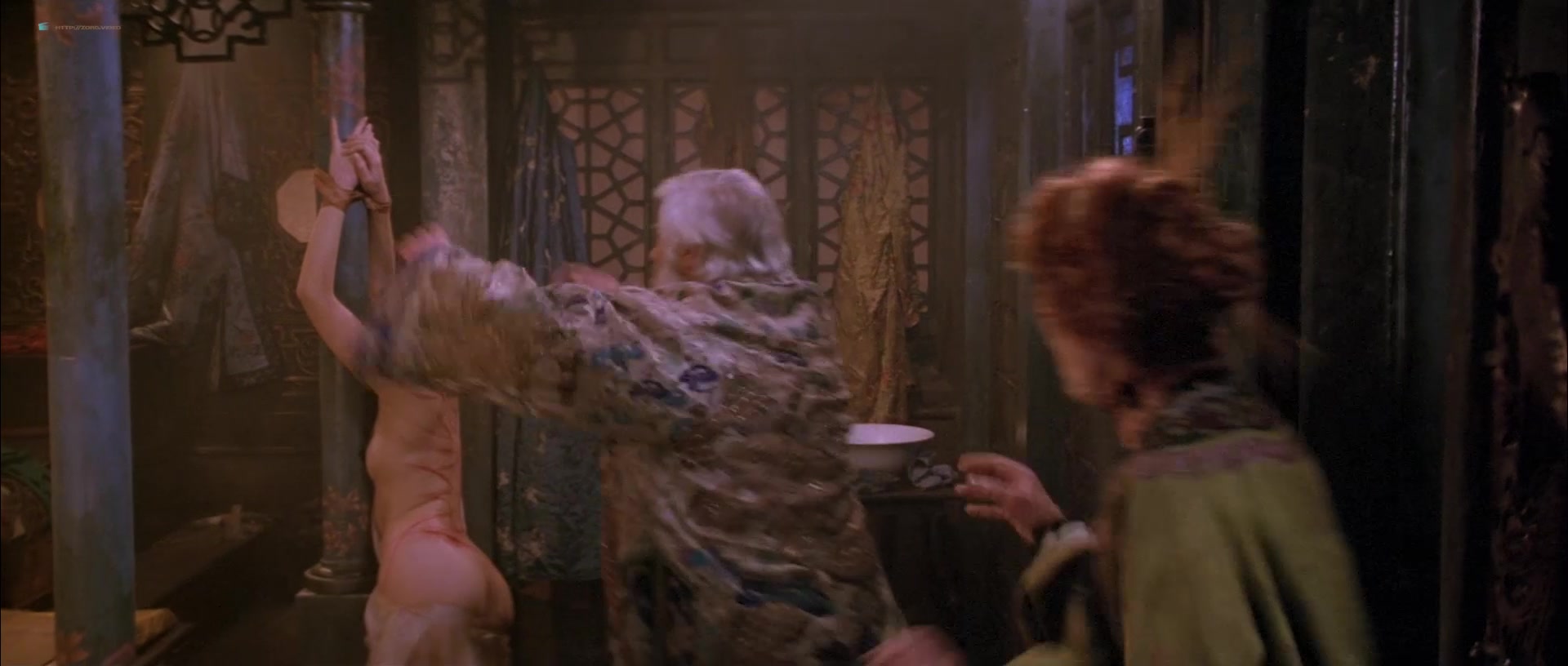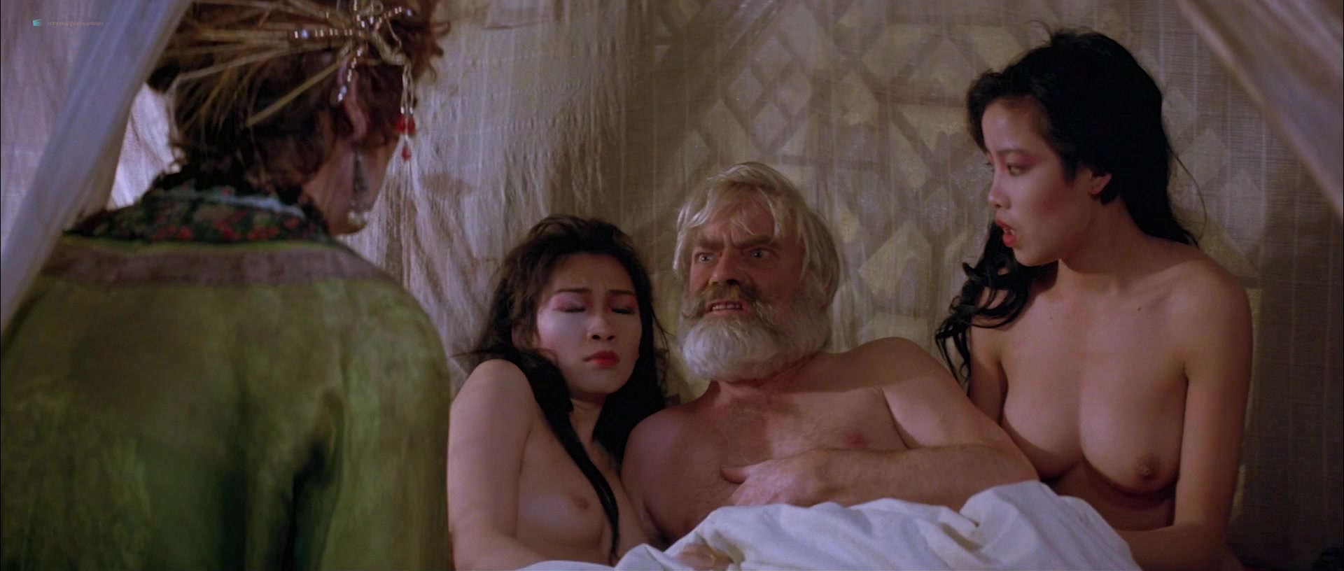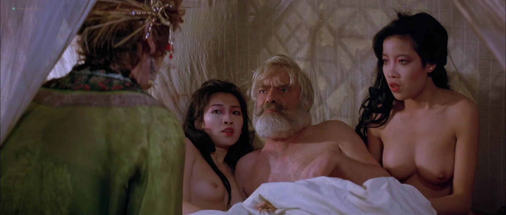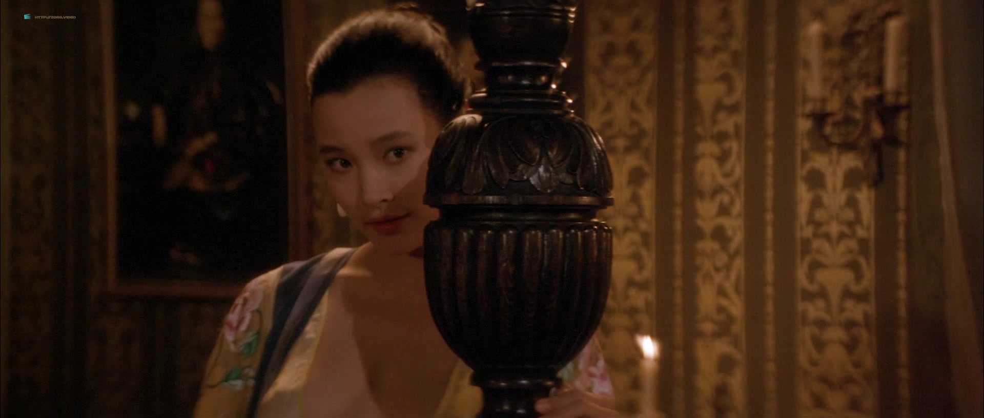 Joan Chen appears in multiple scenes wearing sheer or revealing clothing that accentuates her figure, including a notable instance where she is seen in a transparent silk nightie, through which her breasts are visible. One such scene involves her character sitting by a fire, feeding a man, and later moving to a bed, where the camera lingers on her partially exposed chest as she removes a robe. Another moment features her washing herself with a cloth, briefly exposing her left breast. There’s also a scene where she squeezes her breasts together through a sheer blue nightie while talking to a man, imitating another woman, and a brief bath sequence where she emerges topless, showing her right breast, though it transitions into a more obscured view as she interacts with her co-star.