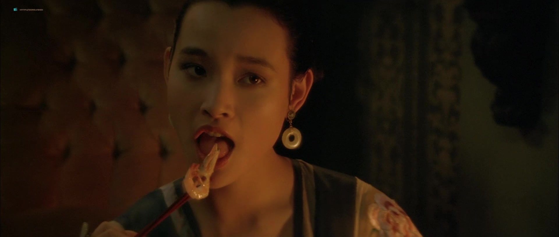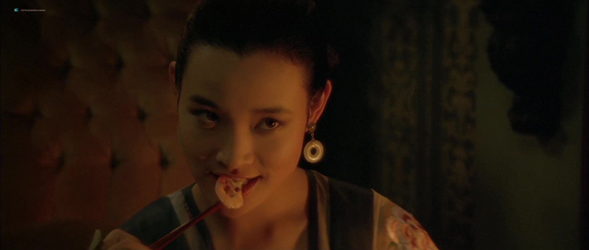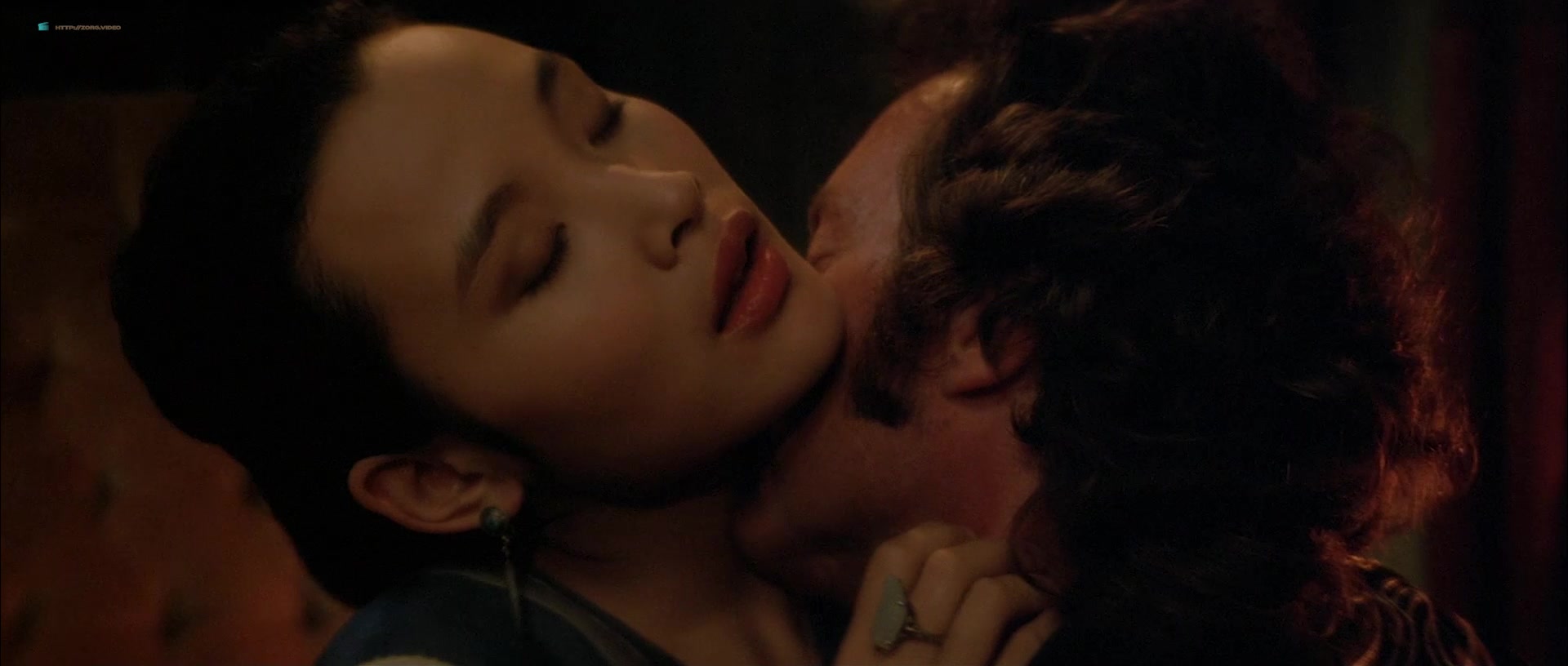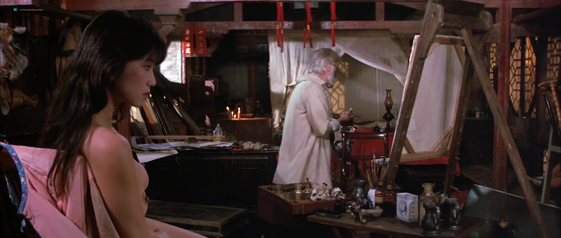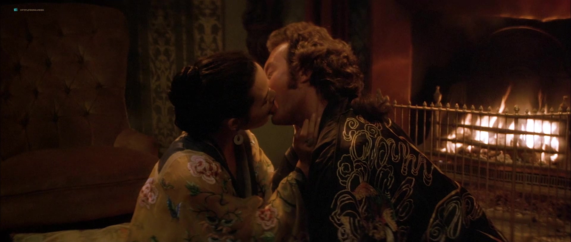 Joan Chen appears in multiple scenes wearing sheer or revealing clothing that accentuates her figure, including a notable instance where she is seen in a transparent silk nightie, through which her breasts are visible. One such scene involves her character sitting by a fire, feeding a man, and later moving to a bed, where the camera lingers on her partially exposed chest as she removes a robe. Another moment features her washing herself with a cloth, briefly exposing her left breast. There’s also a scene where she squeezes her breasts together through a sheer blue nightie while talking to a man, imitating another woman, and a brief bath sequence where she emerges topless, showing her right breast, though it transitions into a more obscured view as she interacts with her co-star.