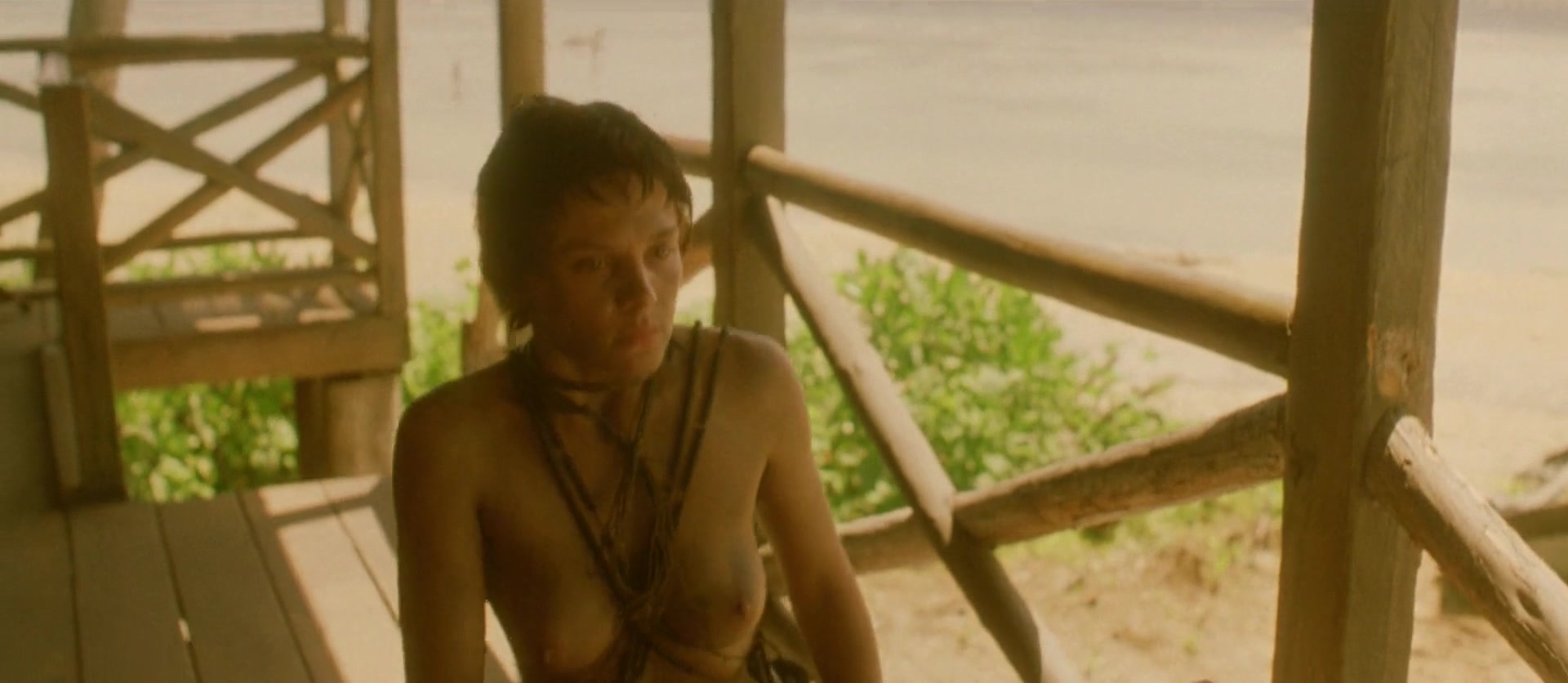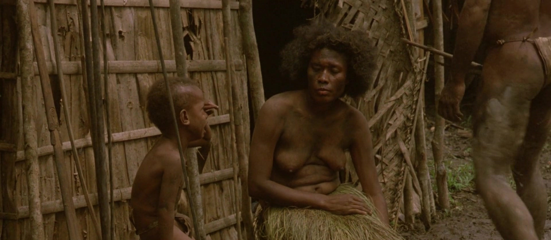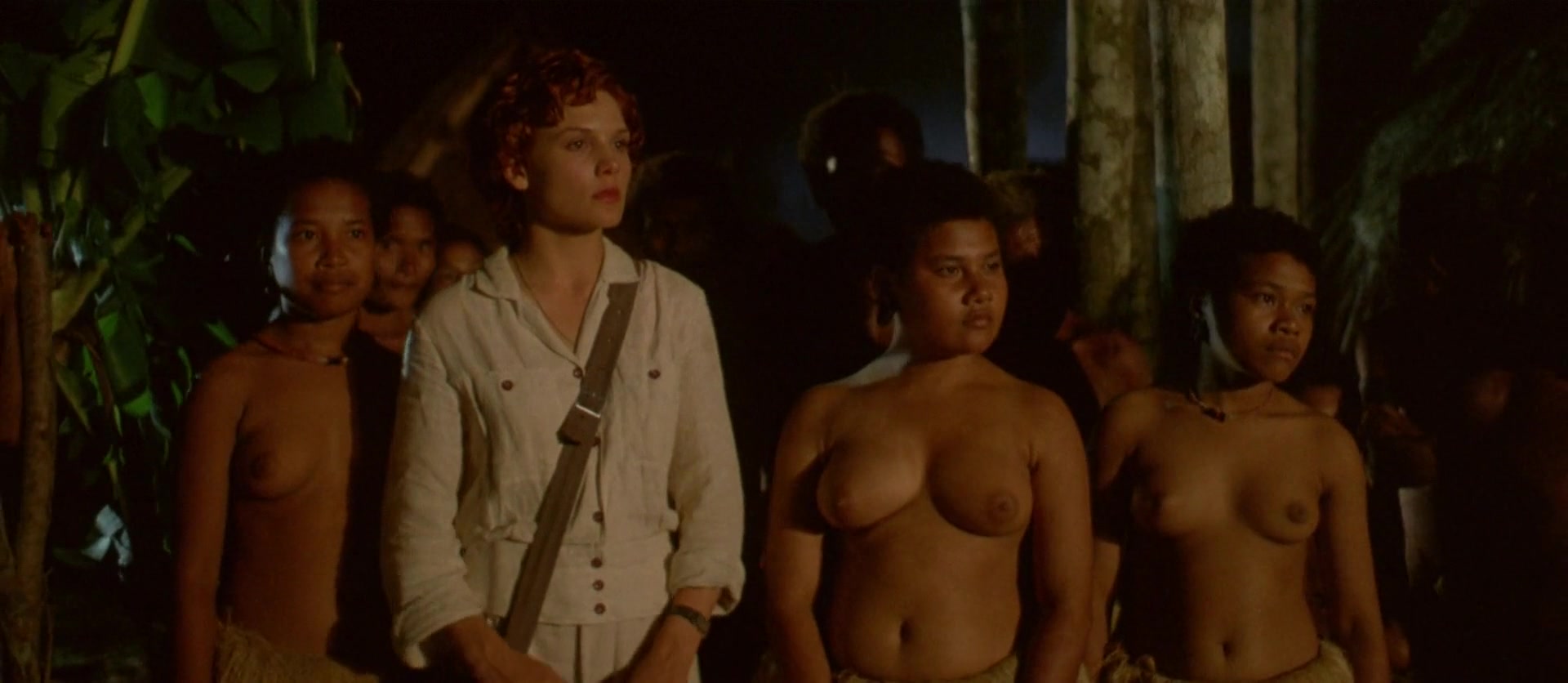 Specific details about the nude scenes include instances where Evelyn engages in intimate moments, showcasing full frontal nudity, as well as topless scenes that occur during her interactions with her husband and later as she integrates into the island's native customs. One notable sequence involves her undergoing a tribal mourning ritual after her husband’s death, where her head is shaved, and she is painted and caged, though this ritual itself is more about cultural depiction than nudity. The nudity in the film has been described as integral to the narrative, reflecting Evelyn’s evolving relationship with the environment and people around her.