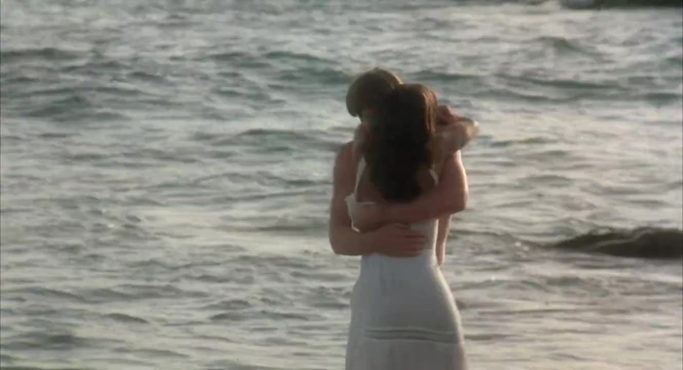Beach Scene: Phoebe Cates is seen in a romantic setting with Matthew Modine, where they are near the sea shore on rocks, engaging in intimate moments. The scene includes Cates in a wet, almost transparent dress, showing partial nudity, and later, with body doubles used for more explicit content.