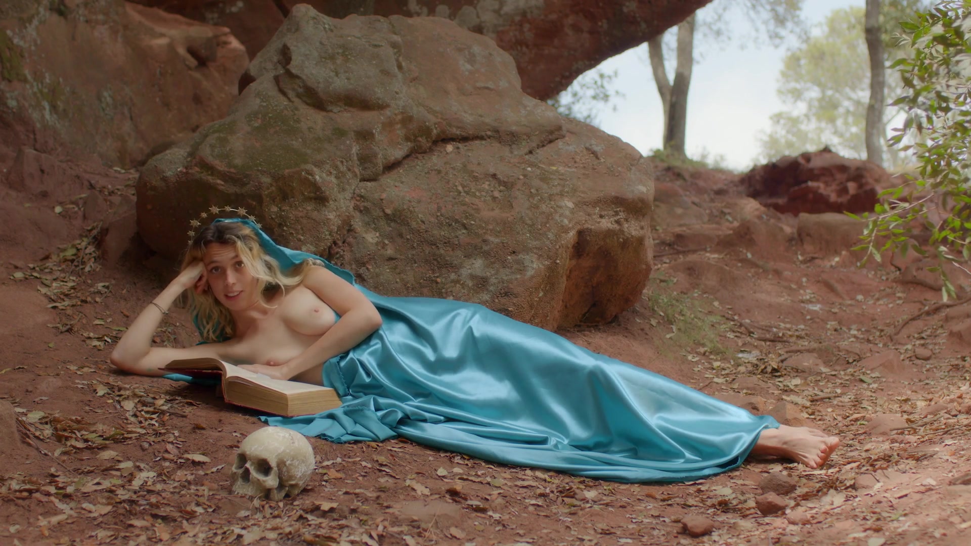Violeta Rodríguez plays the role of Clío, the muse of history and epic poetry. The film opens with a striking scene where Rodríguez is seen masturbating on a rocky beach, setting a provocative and raw tone for the documentary. This scene is unfiltered and highlights her character's sexual agency and the exploration of her role as a muse.Mar Nantas: